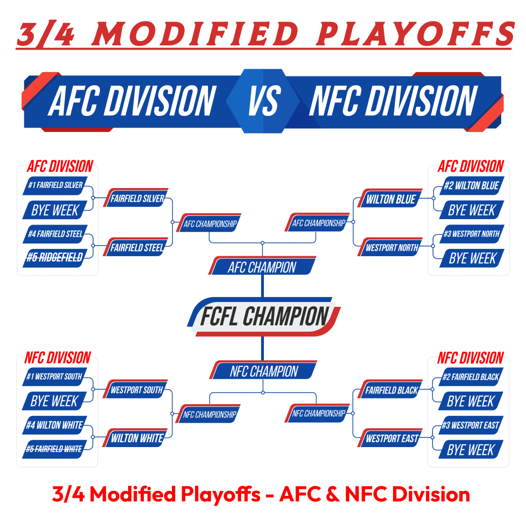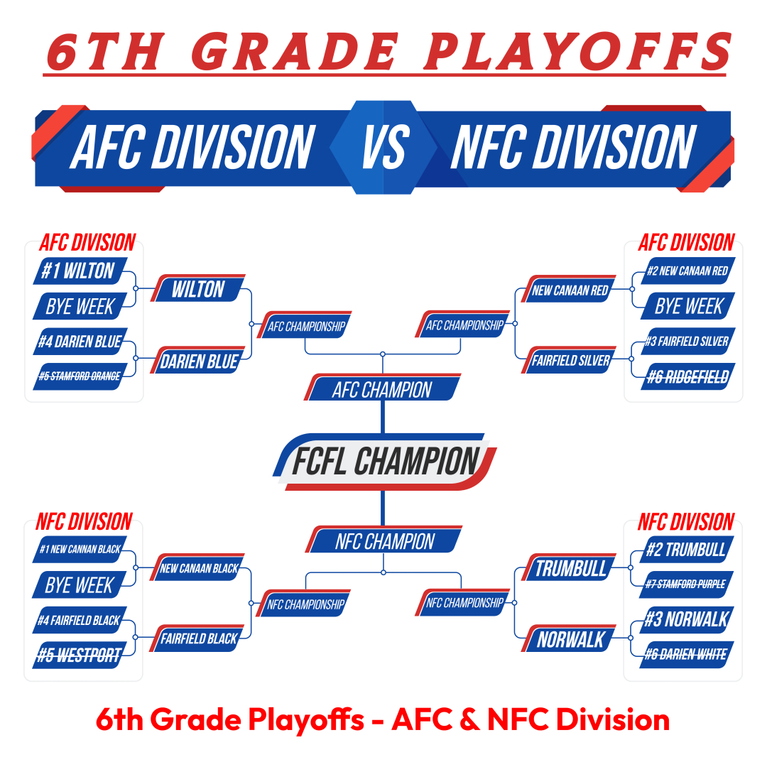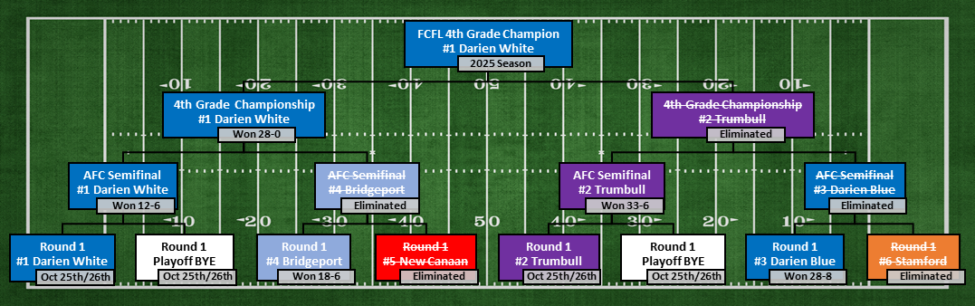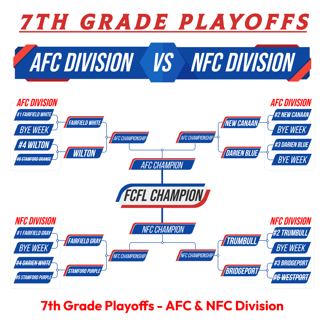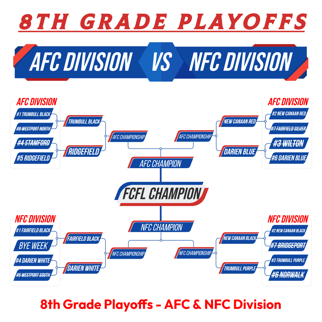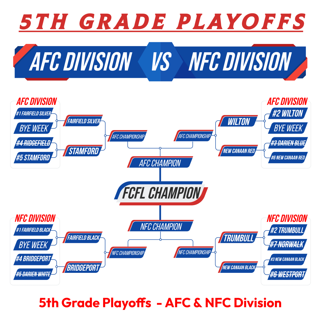 8th Grade = NFC - Darien White7th Grade = AFC - New Canaan Black6th Grade = NFC - New Canaan White5th Grade = AFC, NFC - Fairfield Silver & Black4th Grade = Trumbull Rangers3rd/4th Modified Tackle = Fairfield Grey & Black