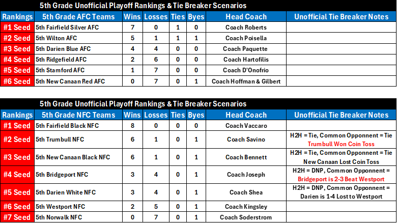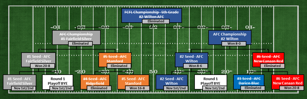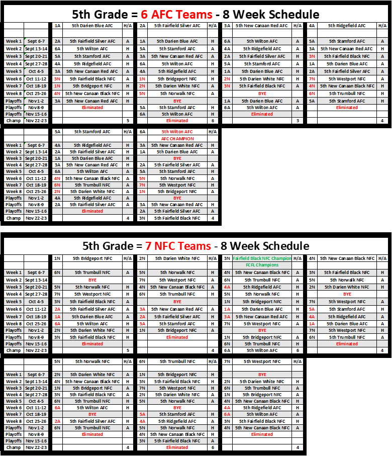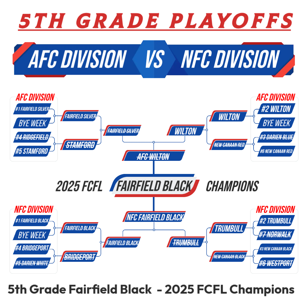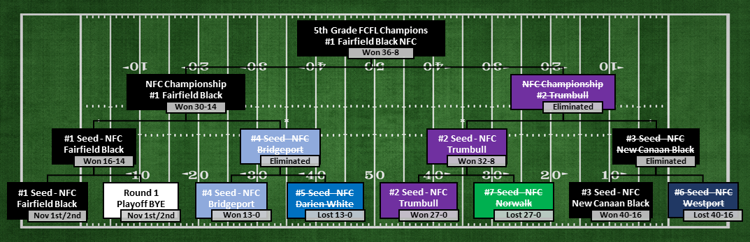November 1st/2nd is Round 1 of AFC & NFC Playoffs = Sweet 16November 8th/9th is Round 2 of AFC & NFC Playoffs = Elite 8November 15th/16th is Round 3 of AFC & NFC Playoffs = Final 4November 22nd/23rd is the FCFL 5th Grade Championship Game 5th Grade FCFL Champions#1 Fairfield Black - Head Coach Rob Vaccaro